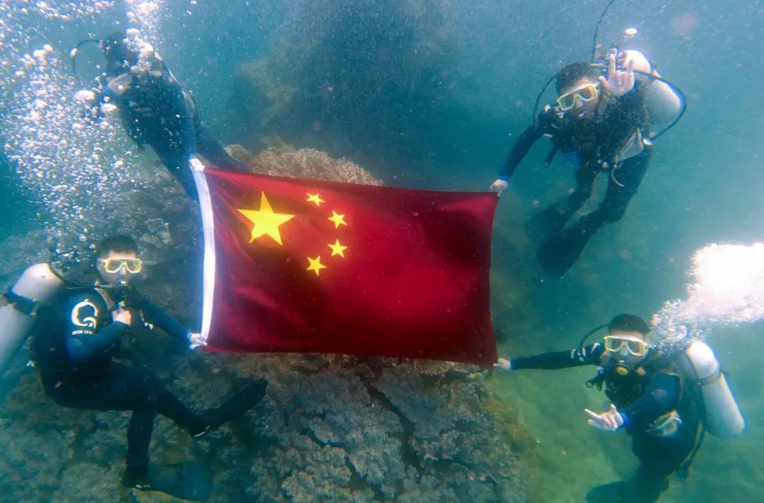 △海南三亞蜈支洲島海域,游客水下展開(kāi)國(guó)旗合影留念。