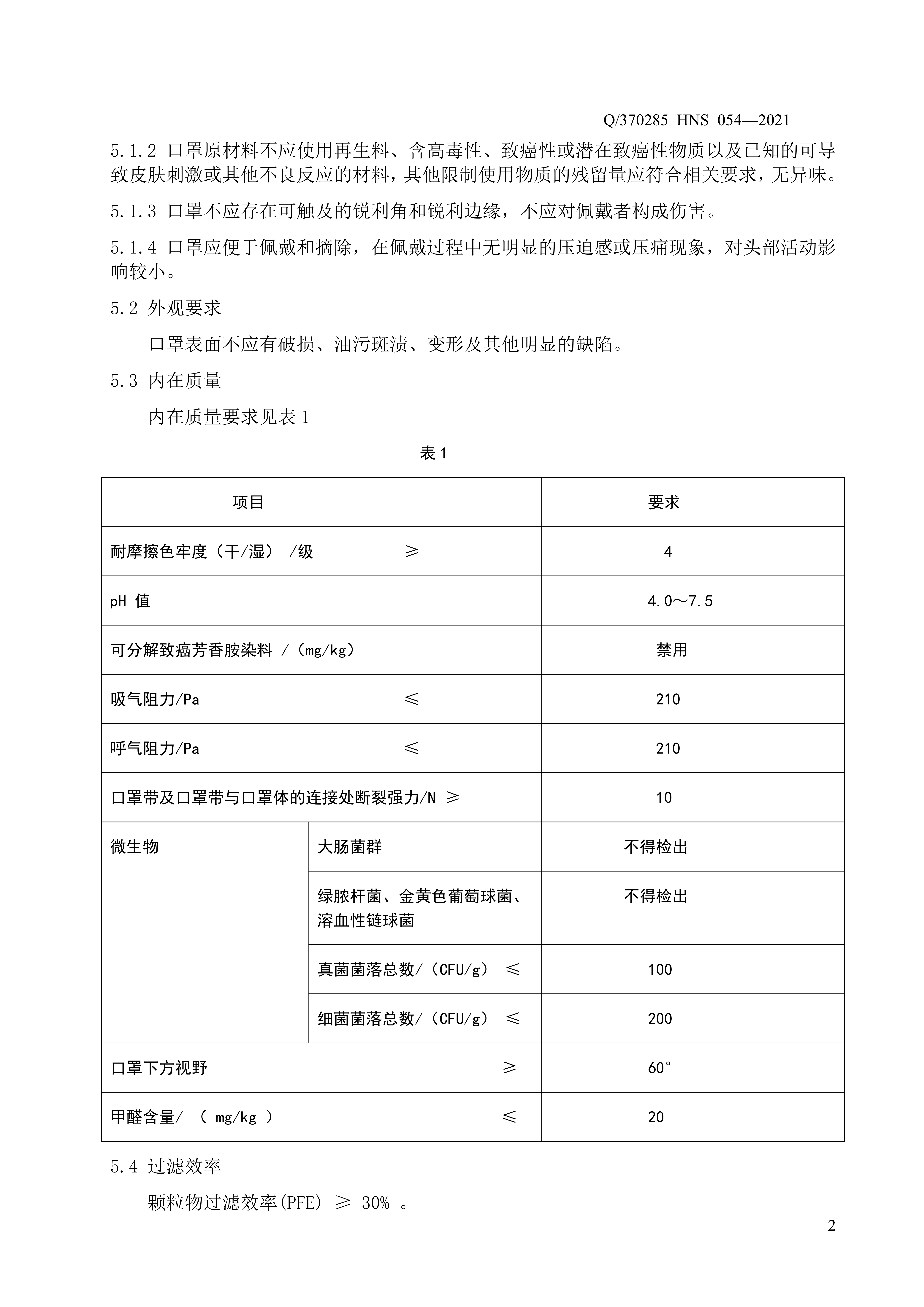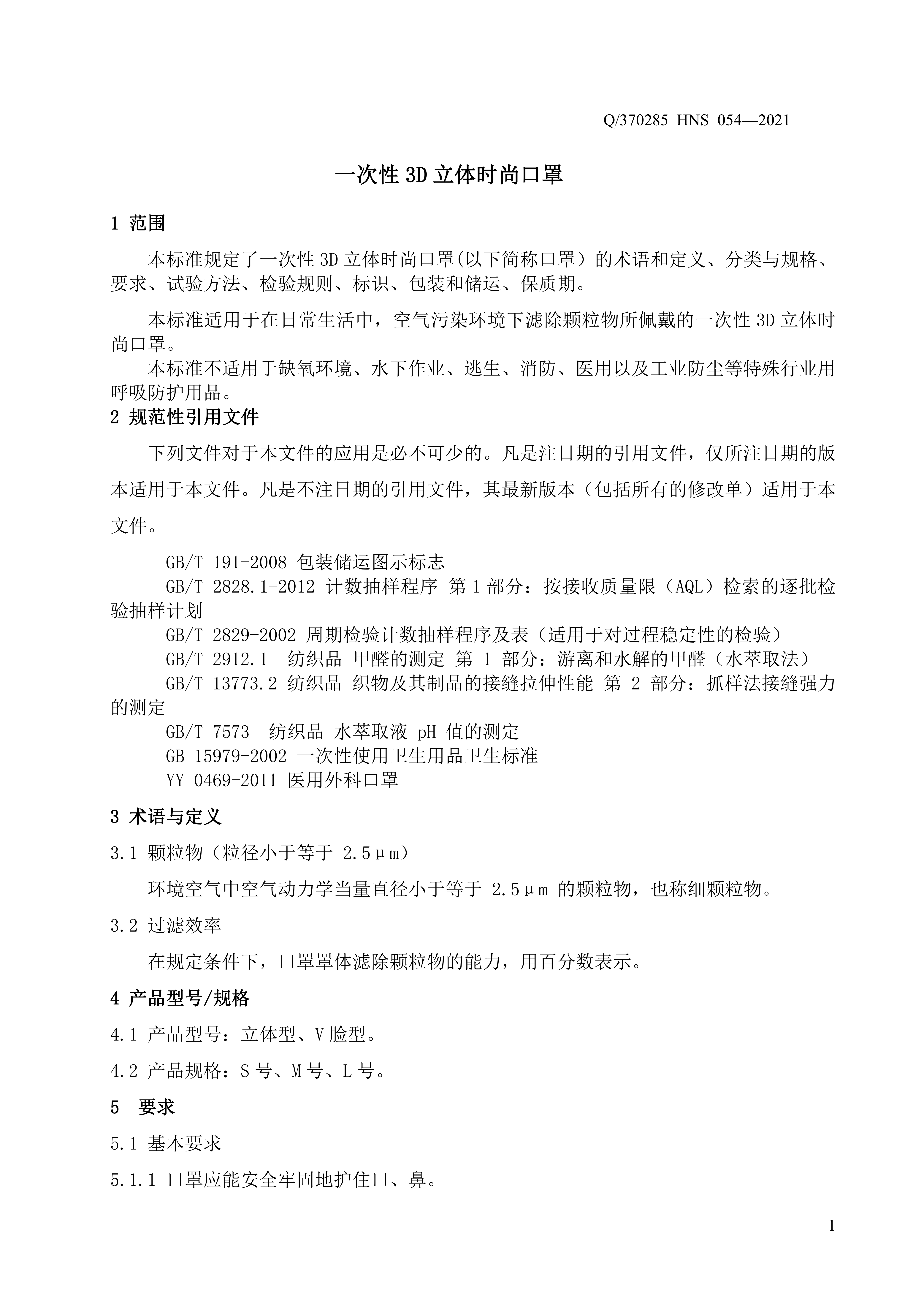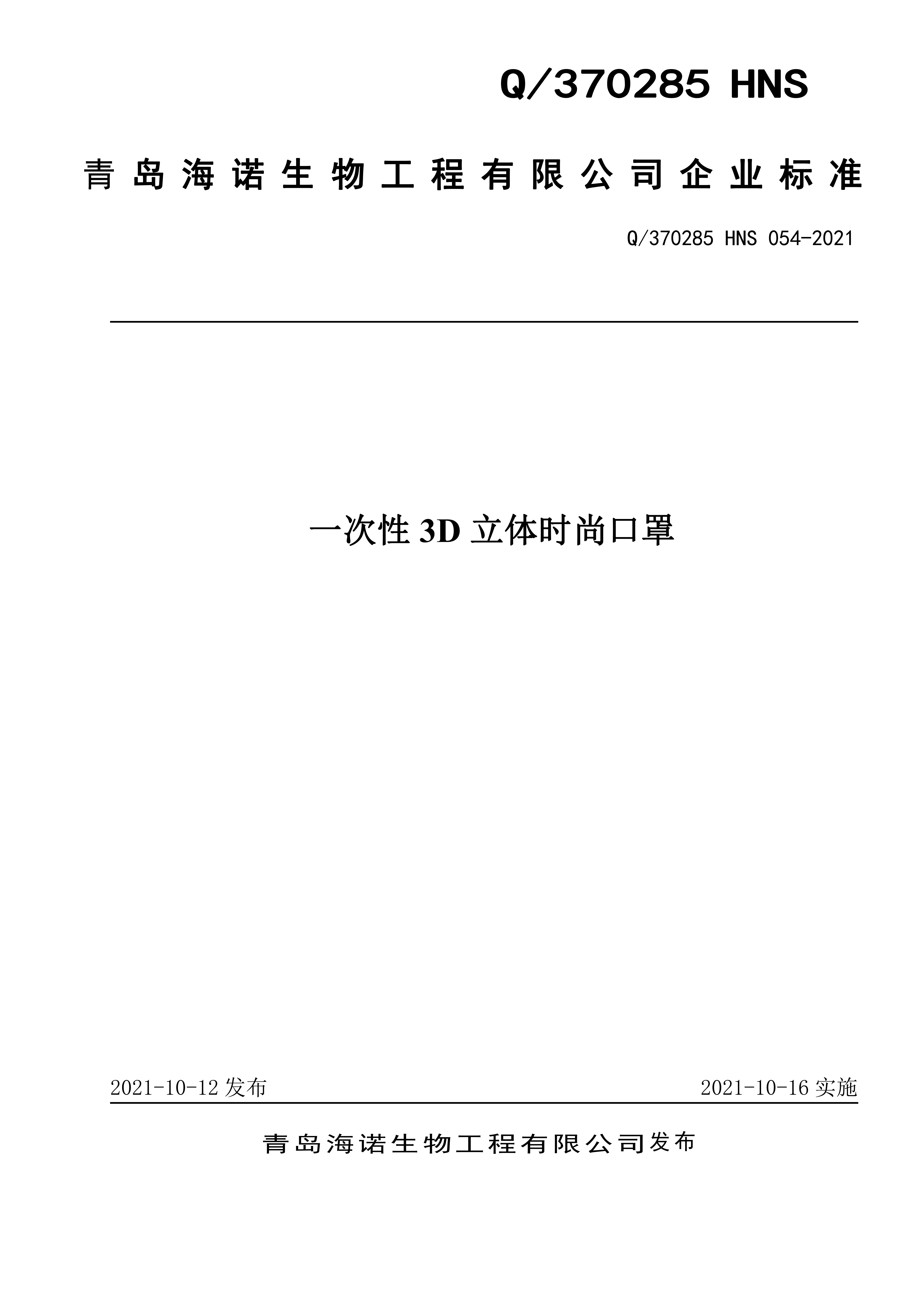 青島海諾生物工程有限公司企業標準 — 一次性 3D 立體時尚口罩