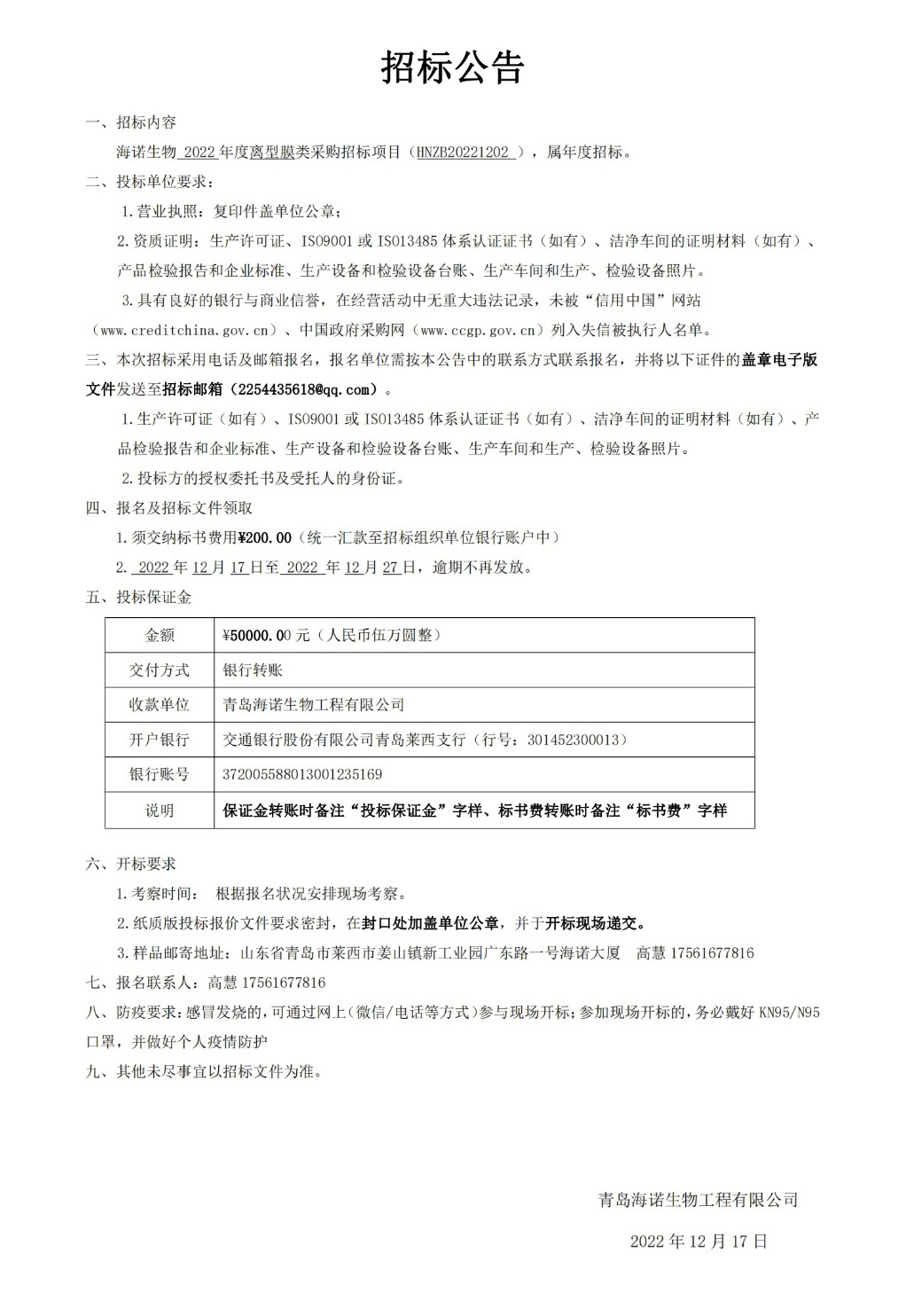 海諾生物2022年度離型膜類采購招標項目正式開啟