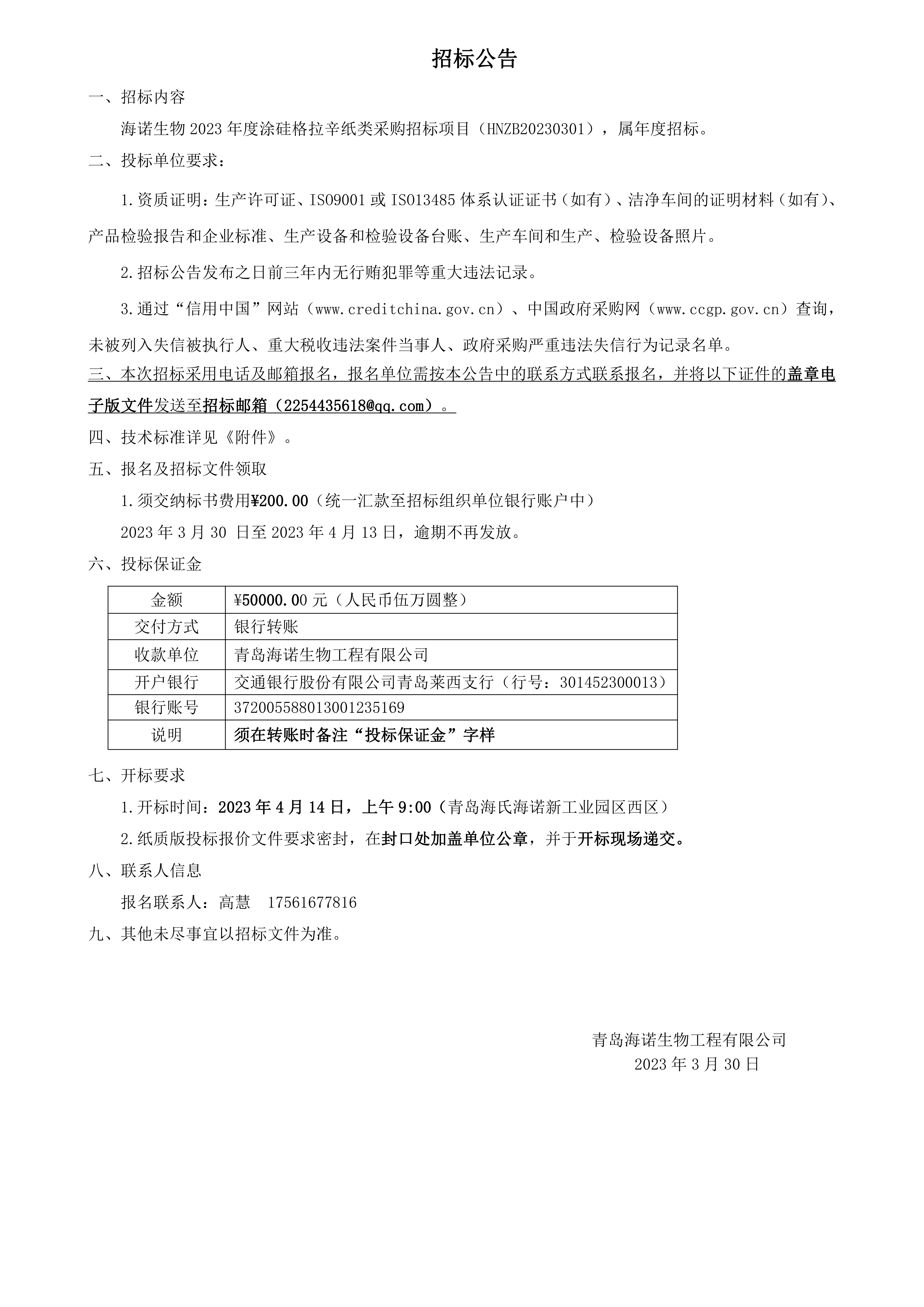 海諾生物 2023 年度涂硅格拉辛紙類采購招標項目現已正式開啟,屆時我們將秉承公正、公平、公開、透明的招標原則,期待優秀供應商的廣泛參與。具體招標細節如下: