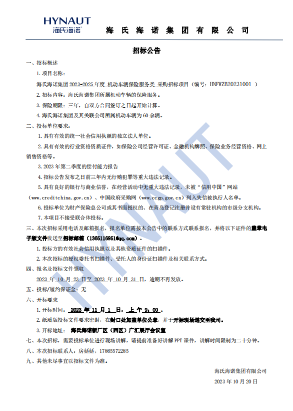 《海氏海諾集團2023-2025年度機動車輛保險服務(wù)類采購招標公告》